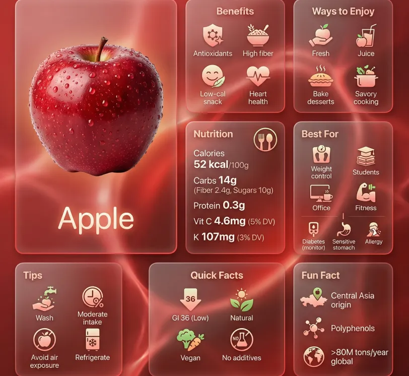 Premium liquid glass Bento grid infographic for Apple (food), English, 16:9 horizontal, ultra-high quality. Asymmetric: hero card ~30%, modules ~70%. Dominant: vibrant saturated red; icons/borders: soft red (30–40% sat, no black). Accents: soft white/cream; green , amber .Hero: ultra-realistic macro photo — glossy fresh red apple, water droplets, sharp detail + "Apple" label.Cards: Apple liquid glass (85–90% trans.), thin soft-red borders, float shadows, refraction, strong inner blur.Background: ethereal red gradients, soft caustics, apple glow, subtle motion light.Content: Benefits (red icons): Antioxidants · High fiber · Low-cal snack · Heart health Ways to Enjoy (icons): Fresh · Juice · Bake desserts · Savory cooking Nutrition (icon + bold): Calories 52 kcal/100g · Carbs 14g (Fiber 2.4g, Sugars 10g) · Protein 0.3g · Vit C 4.6mg (5% DV) · K 107mg (3% DV) Best For: Weight control · Students · Office · Fitness | Diabetes (monitor) · Sensitive stomach · Allergy Tips: Wash · Moderate intake · Avoid air exposure · Refrigerate Quick Facts (icons): GI 36 (Low) · Natural · Vegan · No additives Fun Fact (icons): Central Asia origin · Polyphenols · >80M tons/year global Final: ultra-premium high-res liquid glass infographic — clean, polished, translucent, dynamic lighting. No visible module labels.
