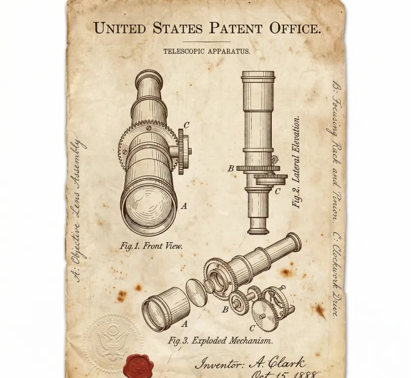 A vintage patent document for a telescope, styled after late 19th-century United States Patent Office filings. The page features precise technical line drawings with numbered annotations (Fig. 1, Fig. 2, Fig. 3), showing front view, side view, and exploded view. Handwritten annotations in steel-pen ink describe the mechanical apparatus. The paper has an aged ivory tone with rust spots and soft creases. In one corner there is an official embossed seal and a red wax seal. At the bottom, the inventor's handwritten signature and date. The overall image evokes the feeling of an authoritative, historical, and slightly mysterious document retrieved from an archive.