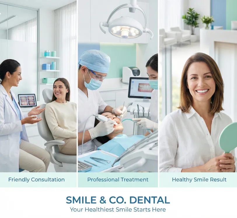 Create a professional 1:1 landscape 1×3 horizontal banner ad for a modern dental clinic.Three equal side-by-side panels, bright modern dental interior, soft white + light blue + mint green color scheme, clean diffused clinical lighting. Mood: safe, trustworthy, hygienic, professional, confident.Style: high-realism healthcare photography, clean minimal composition, no clutter.Negative: dirty tools, dark lighting, scary mood, fake glowing teeth, cartoon, low-res, watermarks, extra text overlays.Panel 1 – Friendly Consultation Mid-shot: smiling dentist in friendly conversation with relaxed patient in bright exam room. Emphasize trust, comfort, eye contact.Panel 2 – Professional Treatment Close-up: gloved & masked dentist performing precise procedure. Highlight sterile modern tools, digital equipment, bright clinical light. Focus: hygiene, precision, advanced technology.Panel 3 – Healthy Smile Result Natural portrait: confident adult with bright healthy teeth, soft natural light. Convey satisfaction, health, self-assurance.Branding: Clinic name: [CLINIC NAME] Tagline: "Your Healthiest Smile Starts Here" Clean medical sans-serif font, caring + professional + modern feel.Place name + tagline elegantly at bottom or integrated subtly. Ultra-clean, premium healthcare advertising look.